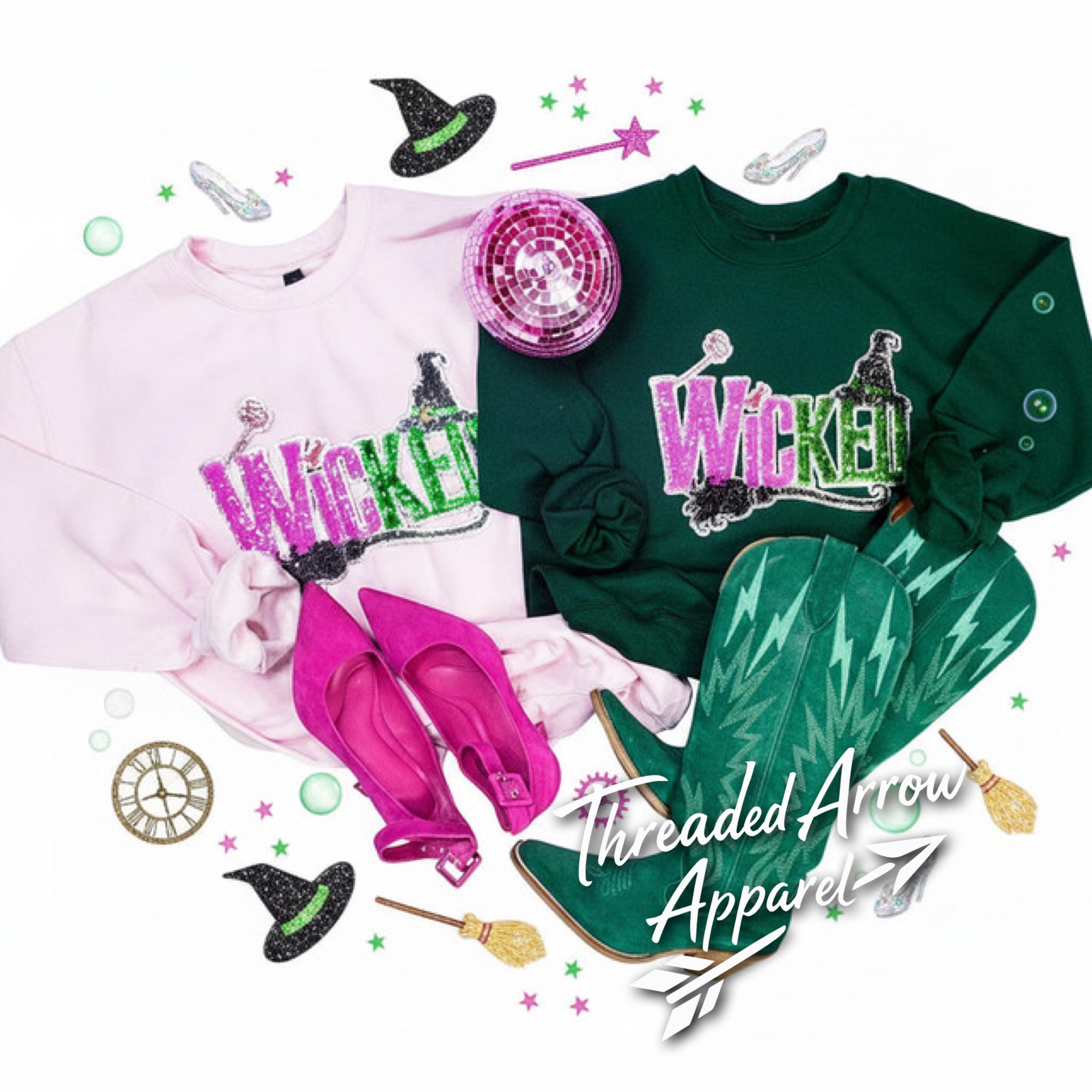 Bring the magic with this Wicked-inspired sequin appliqué sweatshirt, perfect for fall, winter, or any time you want a little sparkle in your everyday style. This cozy Gildan crewneck features a bold sequin appliqué design that’s professionally applied using a commercial-grade heat press for long-lasting wear and durability.